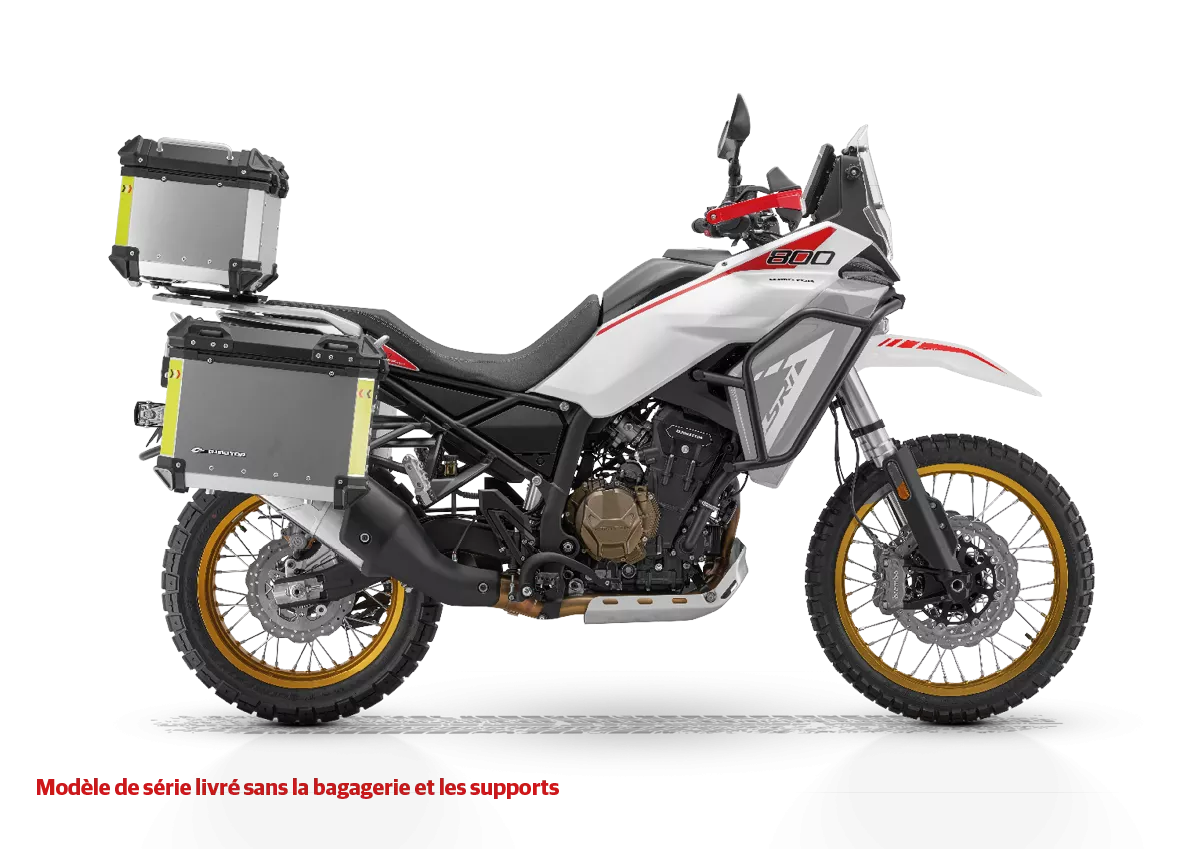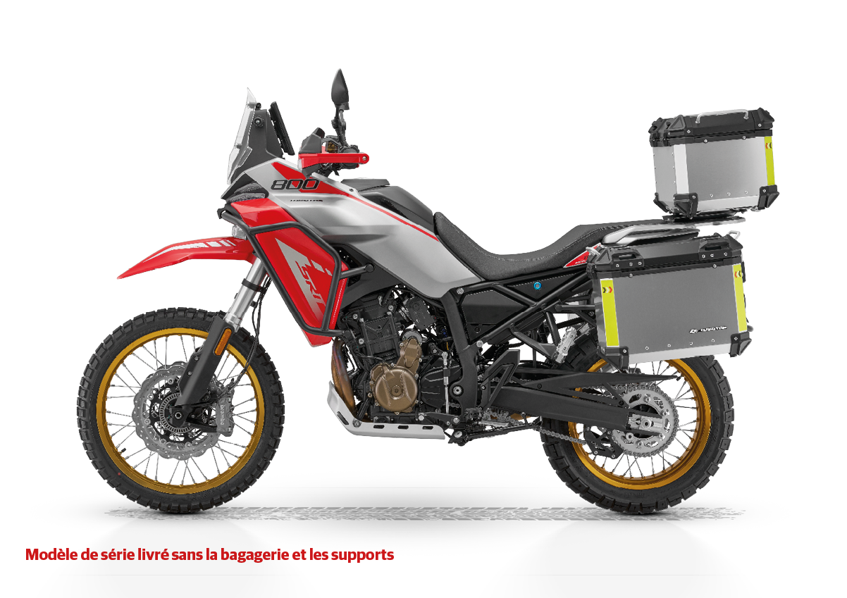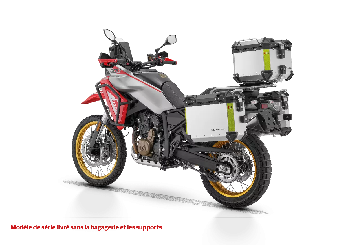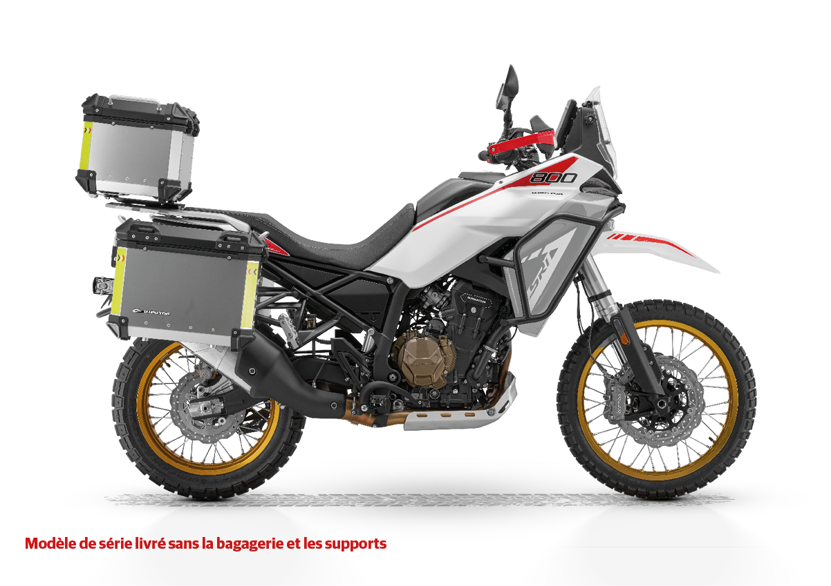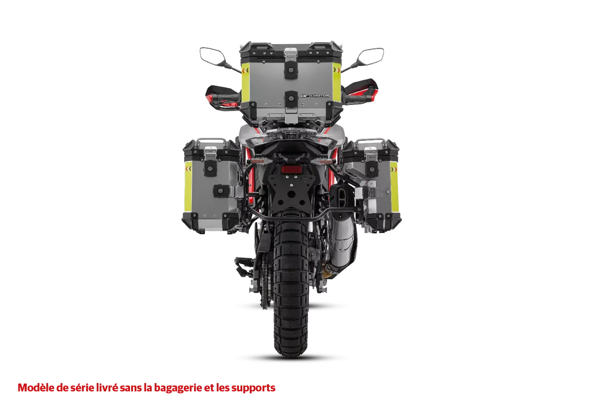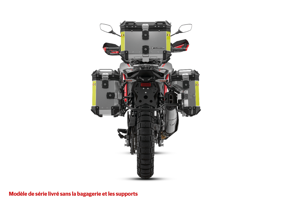 Pensée pour les motards en quête de grands espaces, la SRT 800 RX rivalise avec les références du segment mid-size grâce à son bicylindre parallèle de 799 cm³ développant 95 ch (bridable A2) et 86 Nm de couple. Sa partie-cycle haut de gamme – suspensions Marzocchi, freins Brembo à étriers radiaux, roues tubeless 21’’/18’’– garantit maniabilité, stabilité et confort sur tous les terrains. Dotée de 3 modes de conduite (Standard / Spor t / Pluie), du contrôle de traction, du régulateur de vitesse, d’un quickshifter, du Ride by Wire avec Launch Control, ainsi que d’un écran TFT 5’’ connecté, elle se distingue par un équipement complet de série incluant bulle réglable, protège-mains et sabot moteur.