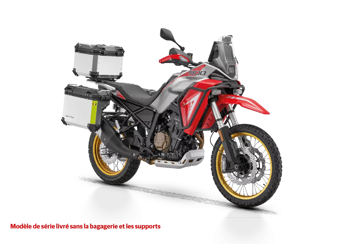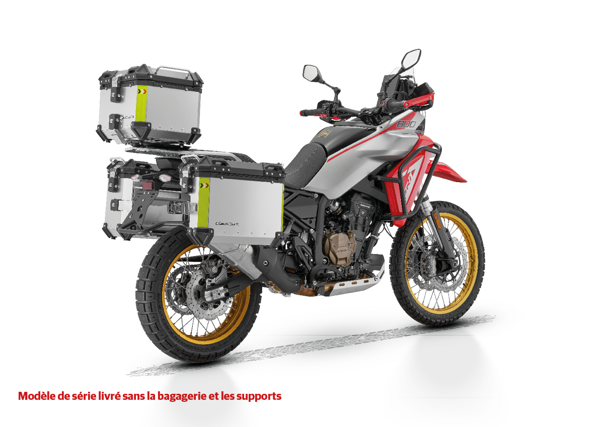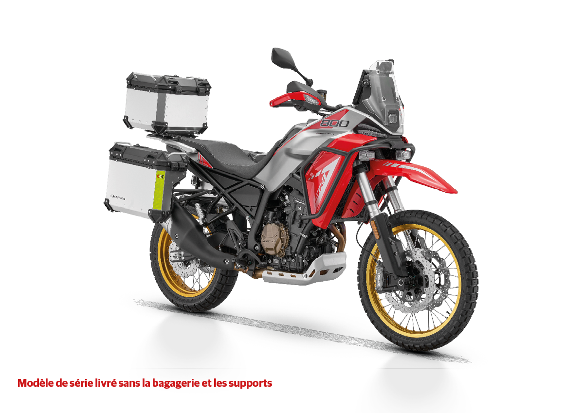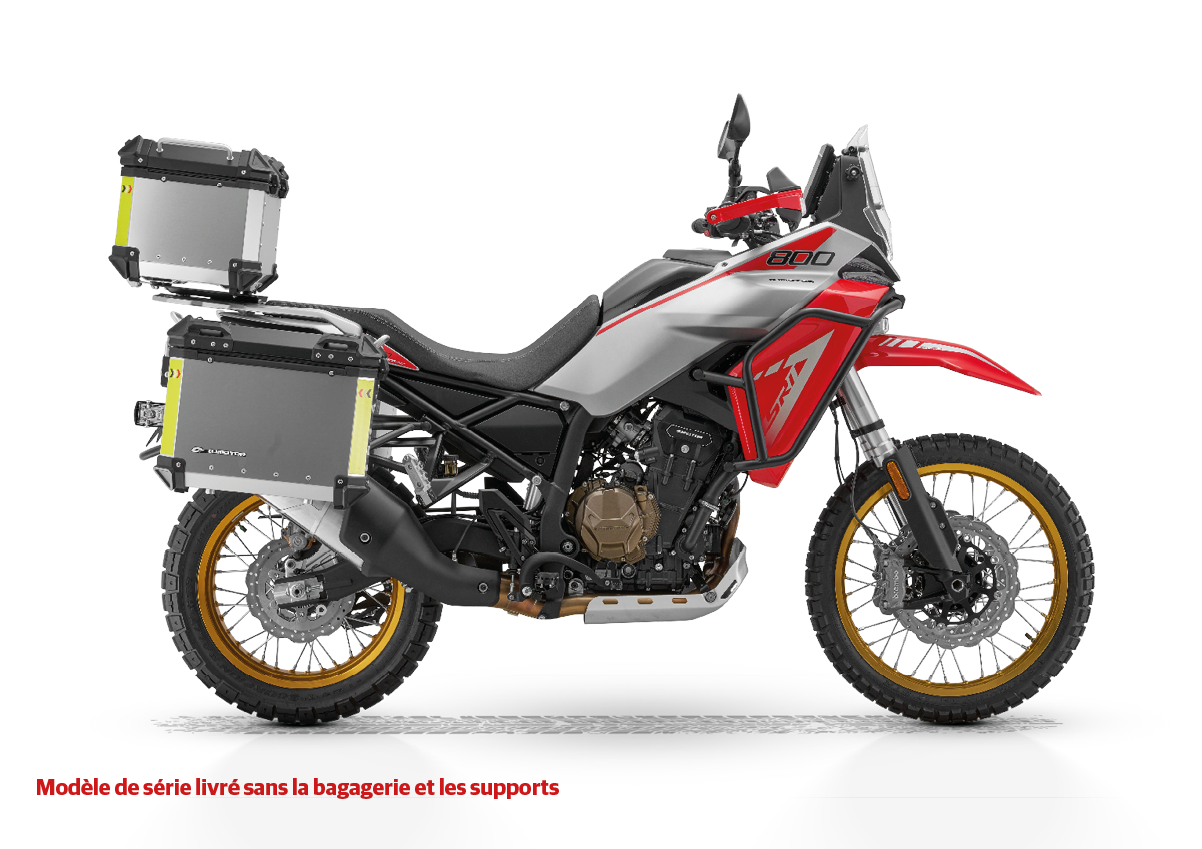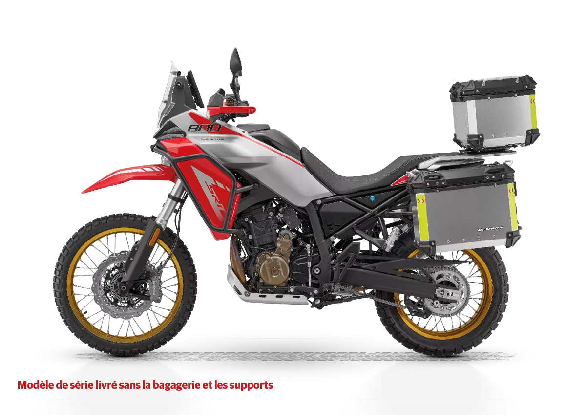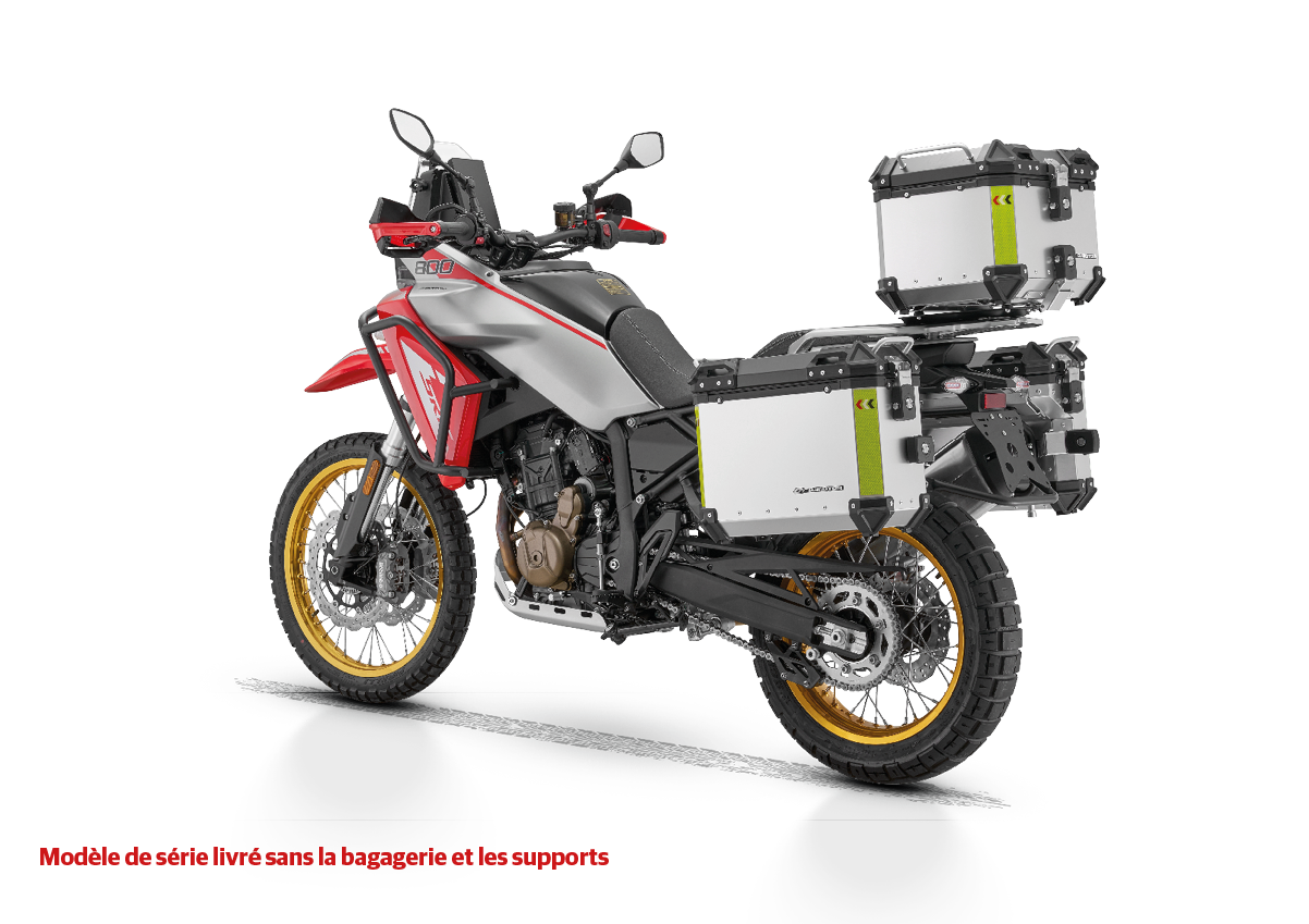 Pensée pour les motards en quête de grands espaces, la SRT 800 RX rivalise avec les références du segment mid-size grâce à son bicylindre parallèle de 799 cm³ développant 95 ch (bridable A2) et 86 Nm de couple. Sa partie-cycle haut de gamme – suspensions Marzocchi, freins Brembo à étriers radiaux, roues tubeless 21’’/18’’– garantit maniabilité, stabilité et confort sur tous les terrains. Dotée de 3 modes de conduite (Standard / Spor t / Pluie), du contrôle de traction, du régulateur de vitesse, d’un quickshifter, du Ride by Wire avec Launch Control, ainsi que d’un écran TFT 5’’ connecté, elle se distingue par un équipement complet de série incluant bulle réglable, protège-mains et sabot moteur.